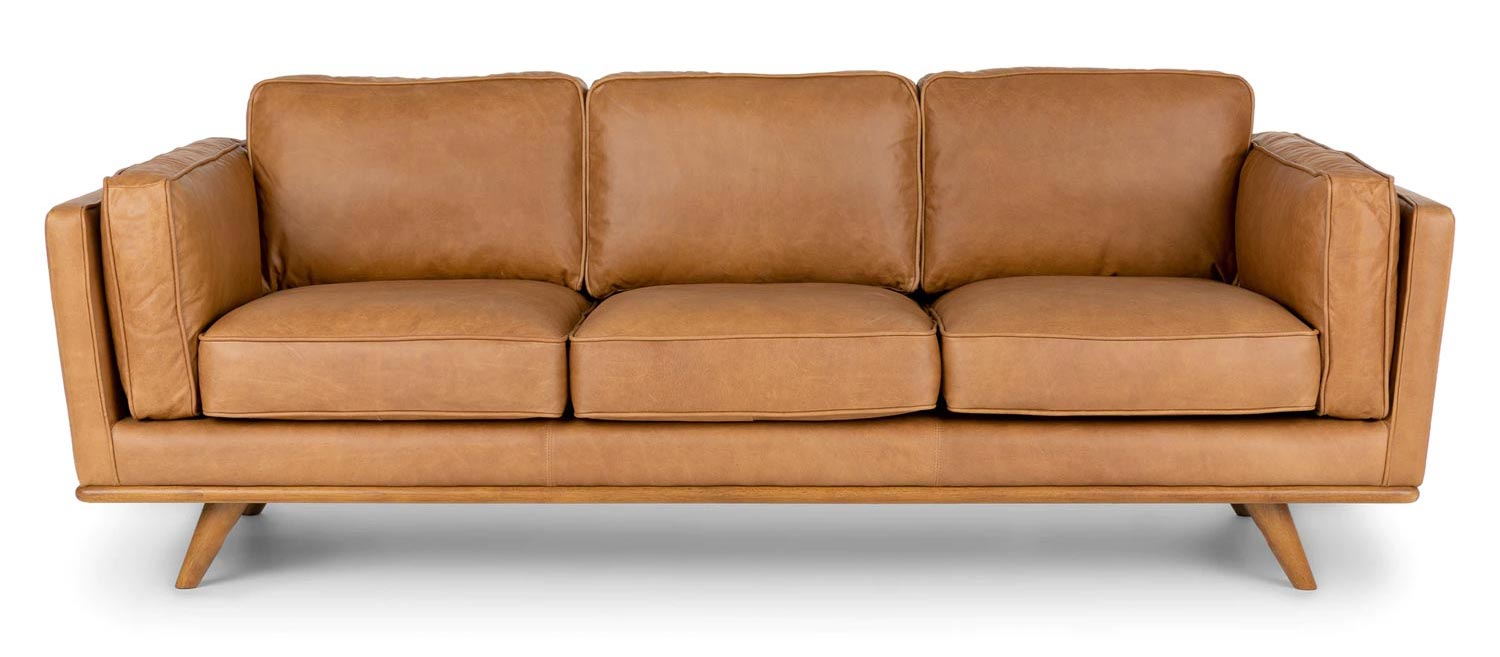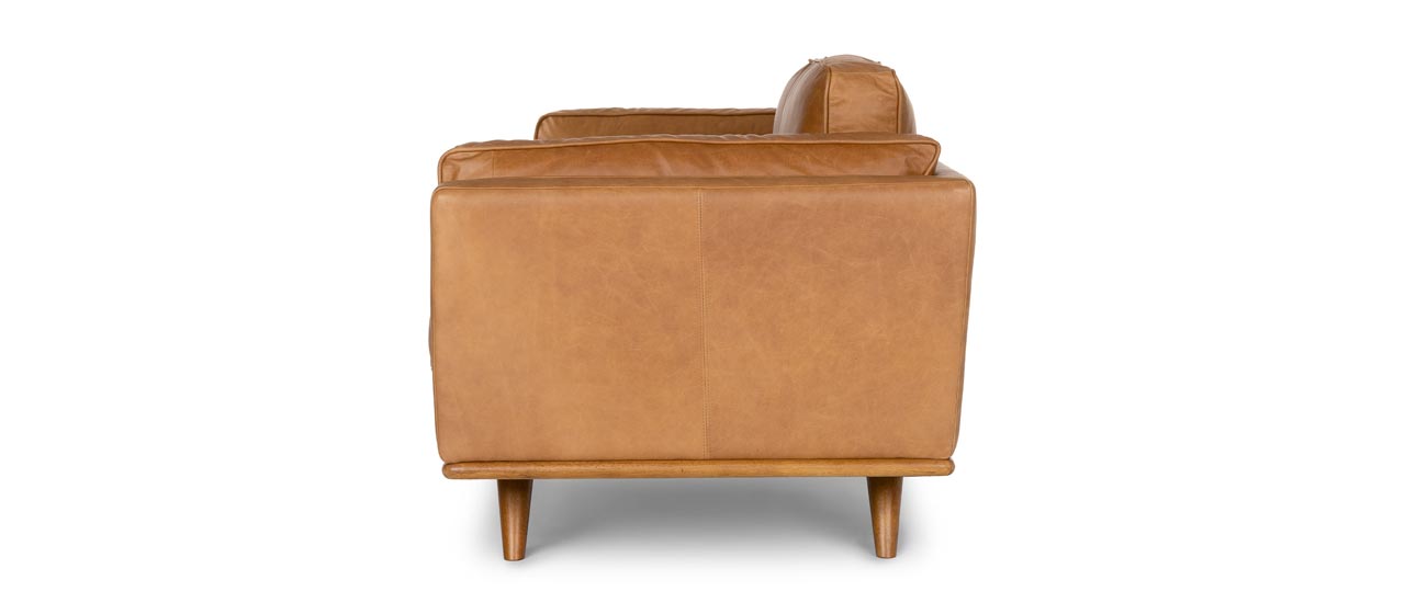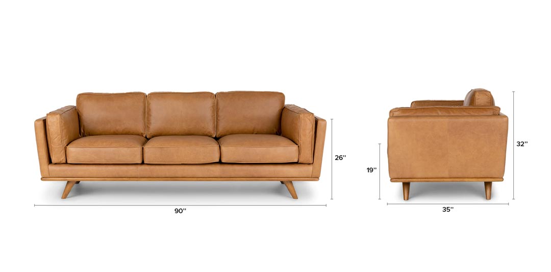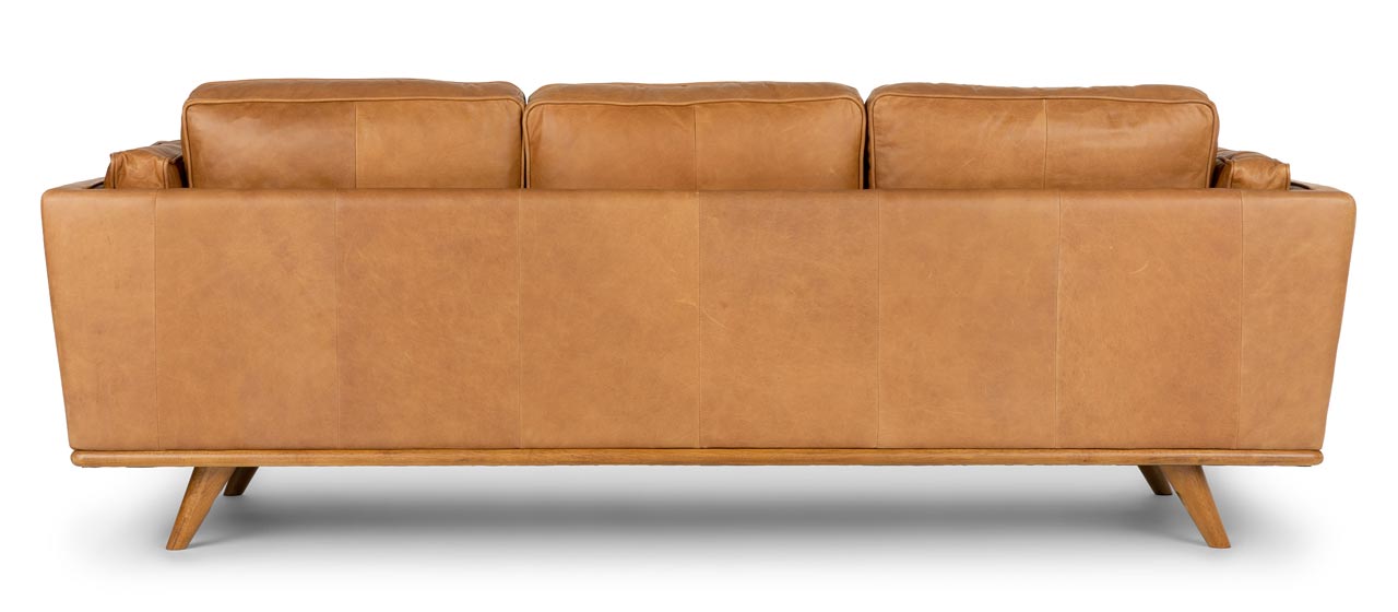 Imagine this tan leather sofa centered on an accent wall or flaunting a beautiful throw. The Timber will inspire you to explore – even if your journey only goes as far as the pantry. With its oak wood trim, feathery cushions, and full-aniline dye process, the Timber is sinkable and plush but cleans up real nice. Natural color variations, wrinkles and creases are part of the unique characteristics of this leather. It will develop a relaxed vintage look with regular use.